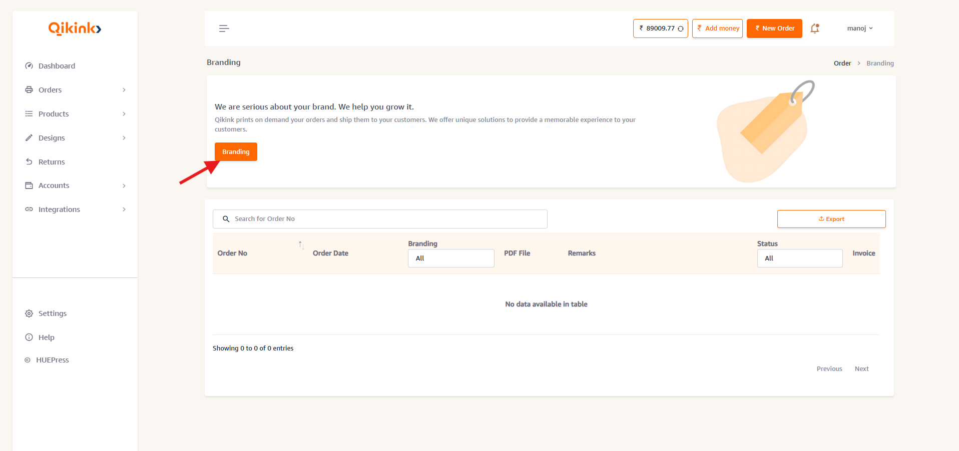 "Placing accessory orders is now simple with Qikink. Follow the below steps to place a successful accessory order." How to Place? 1. Log in to your Merchant Dashboard. Go to Orders > Branding 2. Select the "Branding" button as shown just like the ...