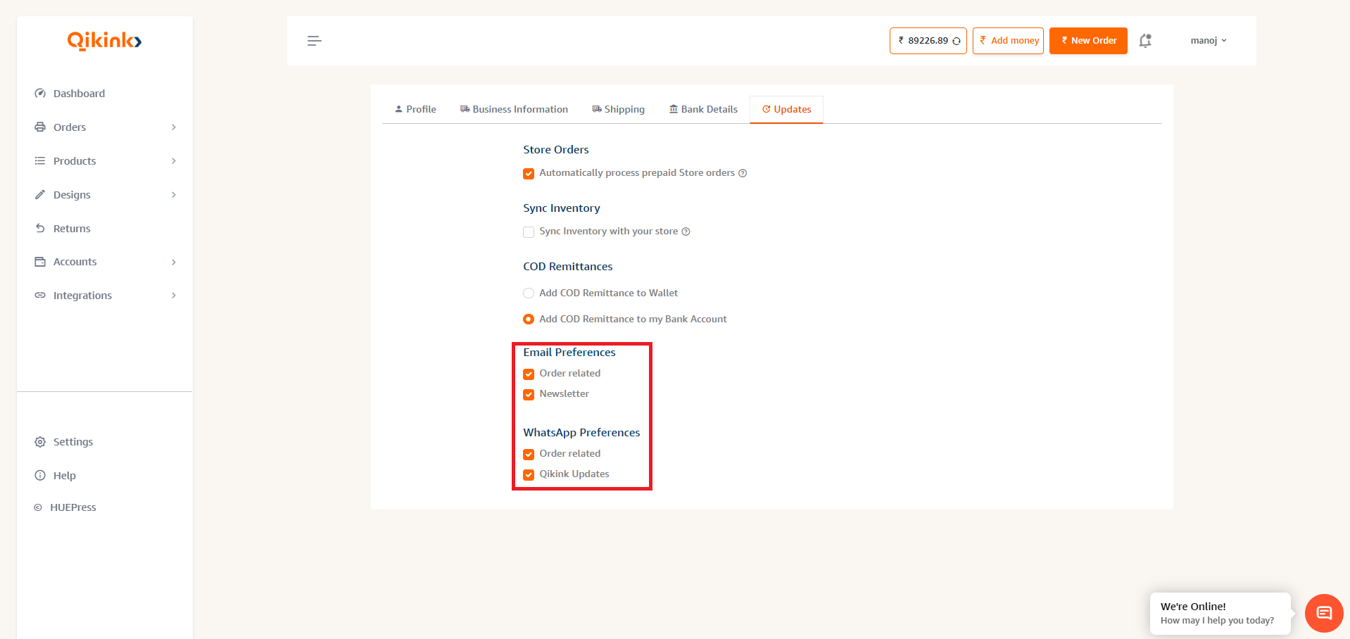- WhatsApp Preferences > Check Order related and Qikink updates