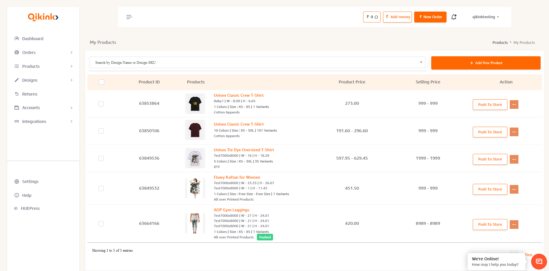 The Push Products feature allows you to send products directly from your Qikink dashboard to your connected online store without manually creating them again.
